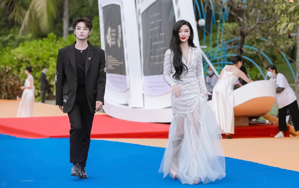 Thai-Chinese singer MiMi Lee, in a stunning white gown, and Chinese singer Li Zhenning, famous in the Chinese idol survival show, Qing Chun You Ni, stride across the blue "red carpet" at the third Hainan Island International Film Festival in Sanya, South China's Hainan province, on Dec 5, 2020. [Photo by Zuo Jianan/chinadaily.com.cn] |