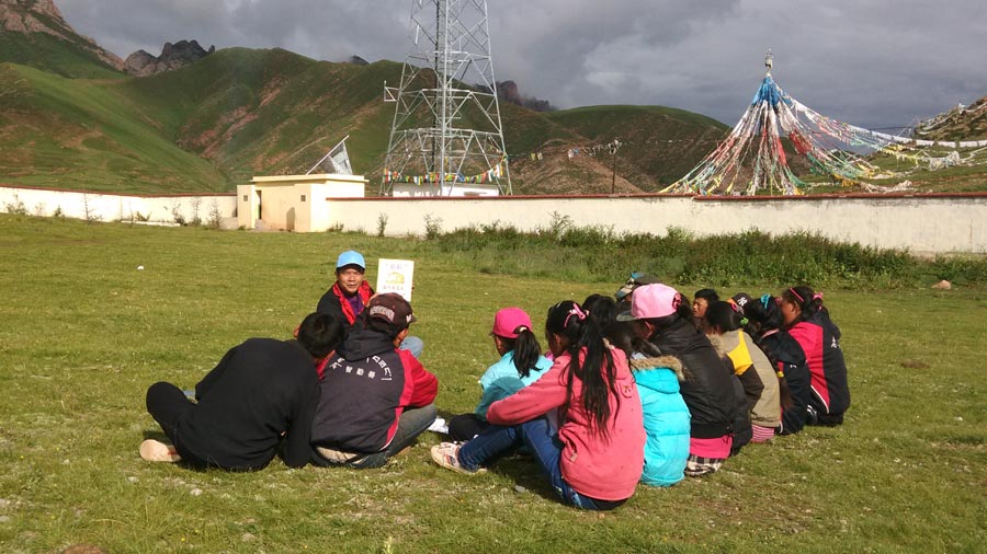 A volunteer from Foshan hosts a reading event for children in the countryside of Yushu Tibet autonomous prefecture in Qinghai province. [Photo Provided to China Daily] |