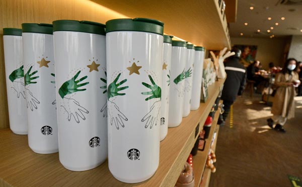 Coffee cups designed by hearing-impaired artists are available for sale at the store. [Photo/Xinhua] |