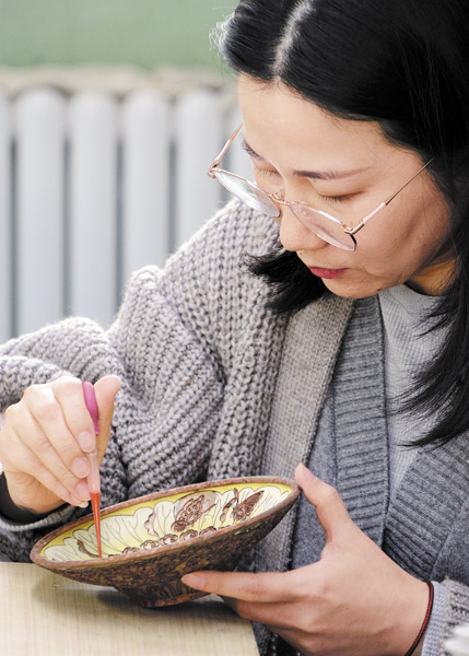 Zhao, a 38-year-old with impaired hearing, started working as a craftswoman at the Beijing Enamel Factory 14 years ago. Her daily work involves applying colored ore powder to objects made of copper, a key step in the process of making cloisonne handicraft.