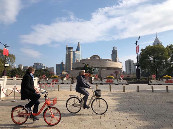 Two foreigners ride bicycles past the Museum of Shanghai in the city center. [PHOTO BY XU XIAOMIN/CHINA DAILY] |