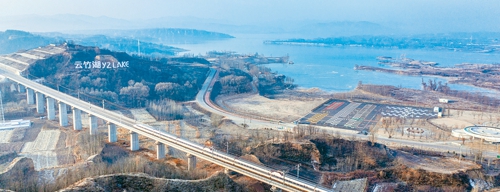 The Taiyuan-Zhengzhou High-Speed Train passes Yunzhu Lake, a renowned tourist attraction in Yushe county.[Photo provided to China Daily] |