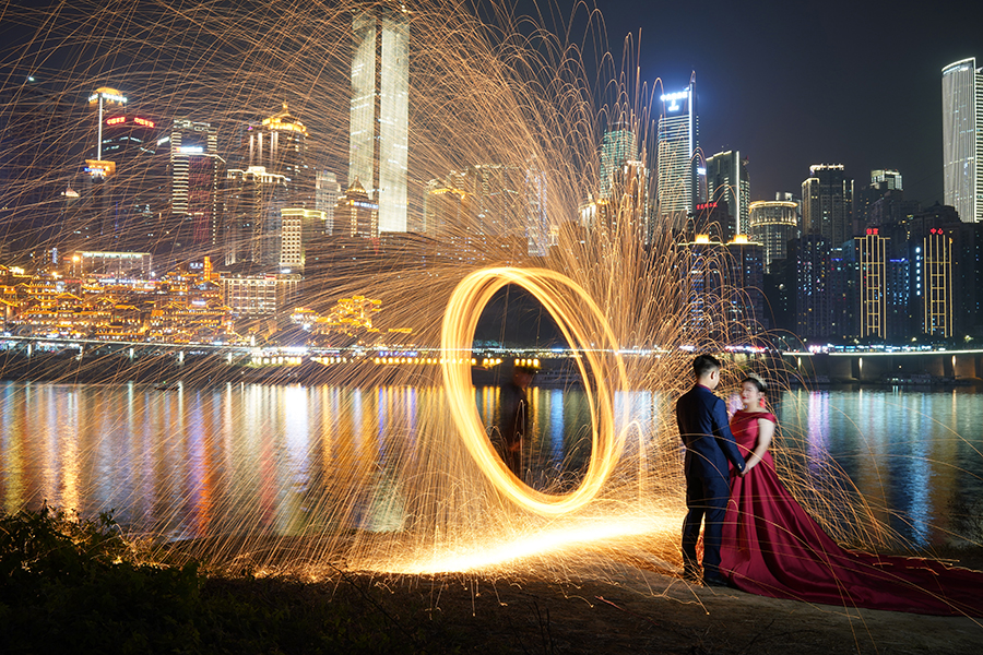 Citizens taking wedding photos by the Jialing River, March 11, 2019. [Photo by Liu Song/China Daily]