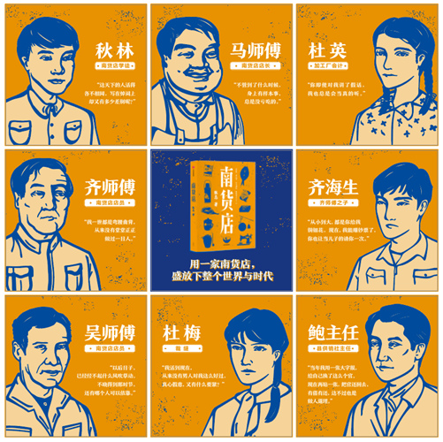 A publicity poster for the novel Nanhuodian (the shop selling goods of the South) by Zhang Ji. The book depicts the staff members and the people that frequent a shop which was part of China's rural-area supply and marketing cooperative from the 1950s to the late '80s. The book's cover can be seen in the center of the poster. [Photo provided to China Daily] |