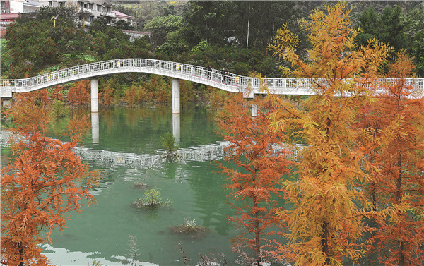 Visitors stroll on a bridge along the picturesque 10-mile corridor in Dazhou township, Chongqing, on Dec 15. [Photo by Wang Quanchao/China Daily] |