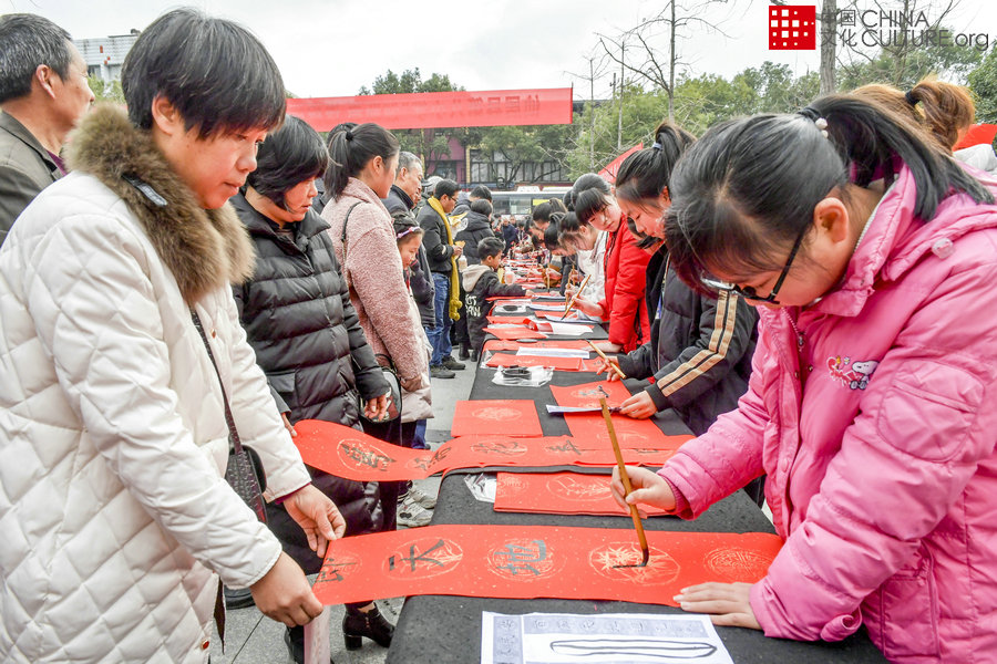 2020年1月12日拍攝于浙江省仙居縣穿城路。2020年1月12日,浙江省臺州市仙居縣第八小學小書法家走上街頭,現(xiàn)場義寫春聯(lián)贈送市民。學生們揮毫潑墨,一對對充滿社會和諧、飽含深情祝福的春聯(lián)躍在大紅的紙上,市民拿著年味十足的春聯(lián),笑臉伴隨筆墨飛揚。[攝影:陳月明]