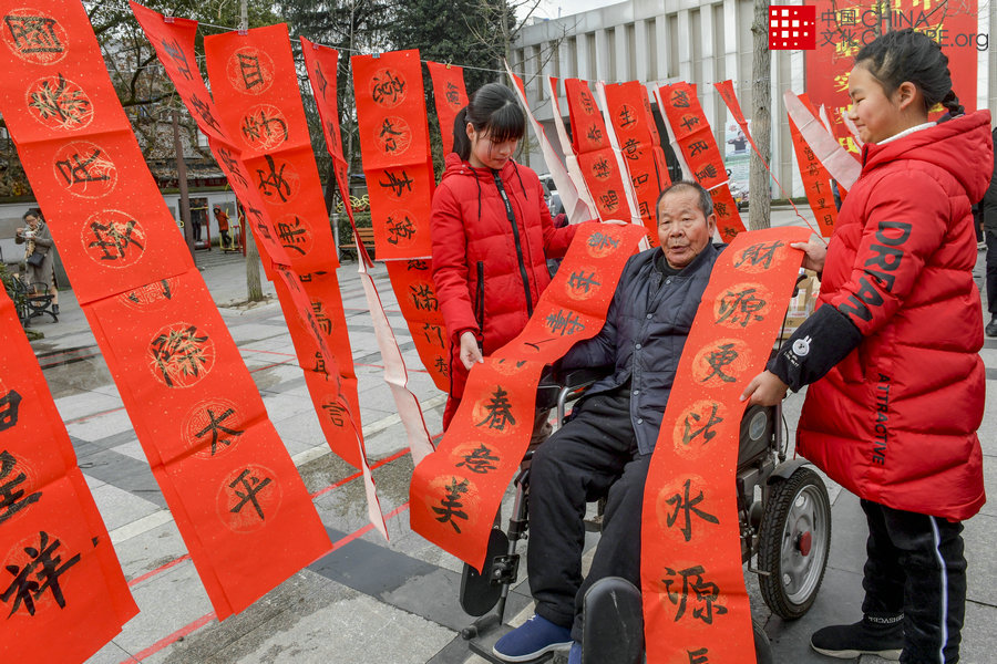 2020年1月12日拍攝于浙江省仙居縣穿城路。2020年1月12日,浙江省臺(tái)州市仙居縣第八小學(xué)小書法家走上街頭,現(xiàn)場(chǎng)義寫春聯(lián)贈(zèng)送市民。學(xué)生們揮毫潑墨,一對(duì)對(duì)充滿社會(huì)和諧、飽含深情祝福的春聯(lián)躍在大紅的紙上,市民拿著年味十足的春聯(lián),笑臉伴隨筆墨飛揚(yáng)。[攝影:陳月明]