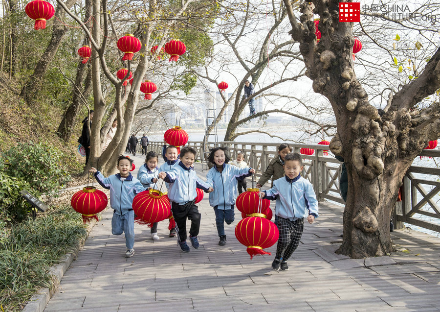 2020年1月8日拍攝于浙江省仙居縣綠道河埠段。浙江省臺(tái)州市仙居縣第一小學(xué)一年級(jí)(7)班小朋友在家長(zhǎng)的陪同下來(lái)到仙居綠道,開(kāi)展放寒假的第一堂社會(huì)實(shí)踐課“體驗(yàn)?zāi)晡丁被顒?dòng)。從“掛燈籠、提燈籠慢跑、頭頂燈籠競(jìng)走、講過(guò)年掛燈籠習(xí)俗”等活動(dòng)中感受年味,學(xué)習(xí)和弘揚(yáng)傳統(tǒng)佳節(jié)的優(yōu)秀文化。[攝影:陳月明]