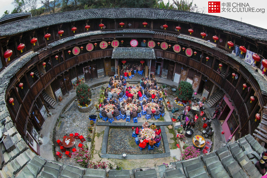 2020年1月15日拍攝于福建省龍巖市永定區(qū)大溪鄉(xiāng)坑頭村。年末將近,大溪坑頭崇裕樓張燈結(jié)彩迎春節(jié),正逢樓內(nèi)居民嫁女,親房叔伯樓內(nèi)喜宴歡聚。[攝影:陳軍]