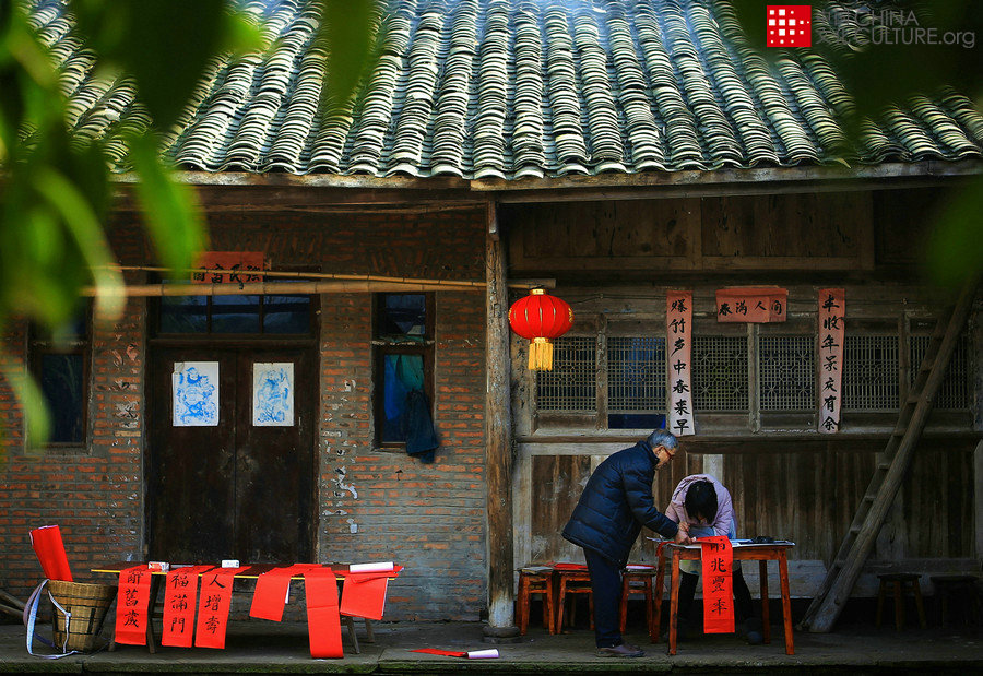 2017年1月21日拍攝于四川雅安。農(nóng)家屋檐下,祖孫攜手寫春聯(lián),翰墨香里添年味。[攝影:艾加憲]