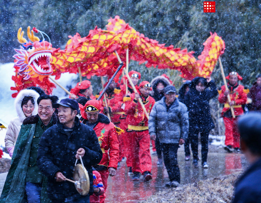 2018月2月拍攝于甘肅隴南。在甘肅省隴南市成縣雞峰鎮(zhèn)連寺村,村民自發(fā)組織社火隊冒著飛雪走村串鄉(xiāng),喜迎新春。[攝影:吳庭棟]