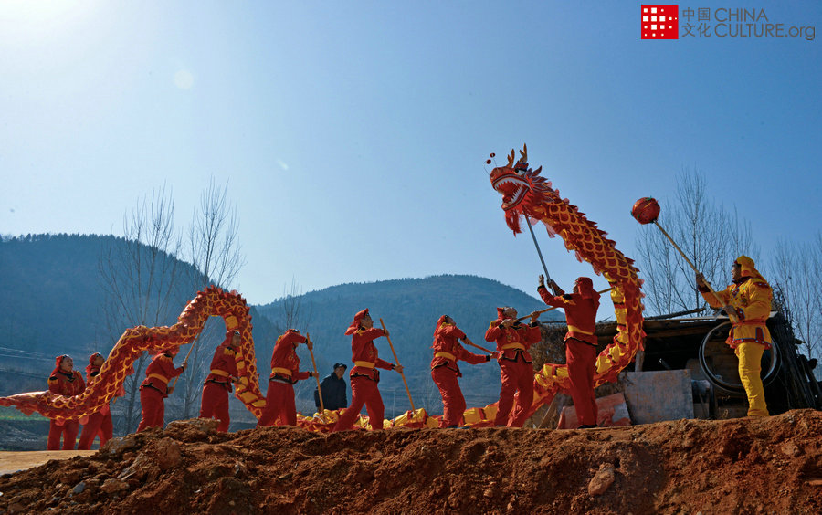 2019年2月5日拍攝于河南省南陽(yáng)市淅川縣橫溝村。大年初一,脫貧后淅川縣橫溝村村民舞龍歡度春節(jié)。[攝影:肖社會(huì)]