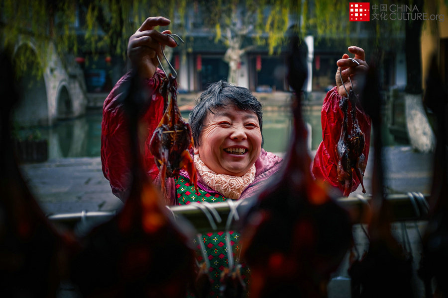 2019年1月10日拍攝于浙江寧波。浙江省安昌的臘月,又到了家家戶戶晾曬臘貨的季節(jié)。[攝影:章小靜]