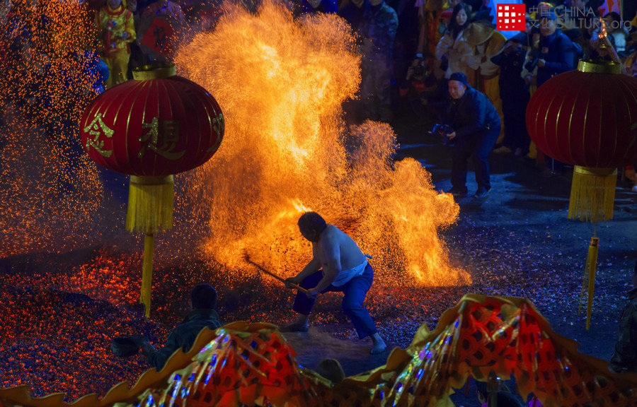 2020年1月17日拍攝于浙江金華磐安雙峰鄉(xiāng)大皿村?!盁捇稹薄笔墙鹑A磐安千年絕活,被列入浙江省第一批非遺項(xiàng)目。具有神秘地域文化色彩,煉火通常在夜晚進(jìn)行,參加活動(dòng)者皆提前沐浴凈身,休息養(yǎng)神。煉火有乞愿來年興旺發(fā)達(dá)的意喻。[攝影:董小飛]