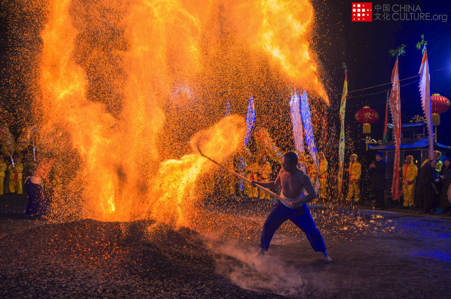 2020年1月17日拍攝于浙江金華磐安雙峰鄉(xiāng)大皿村?!盁捇稹薄笔墙鹑A磐安千年絕活,被列入浙江省第一批非遺項目。具有神秘地域文化色彩,煉火通常在夜晚進行,參加活動者皆提前沐浴凈身,休息養(yǎng)神。煉火有乞愿來年興旺發(fā)達的意喻。[攝影:董小飛]