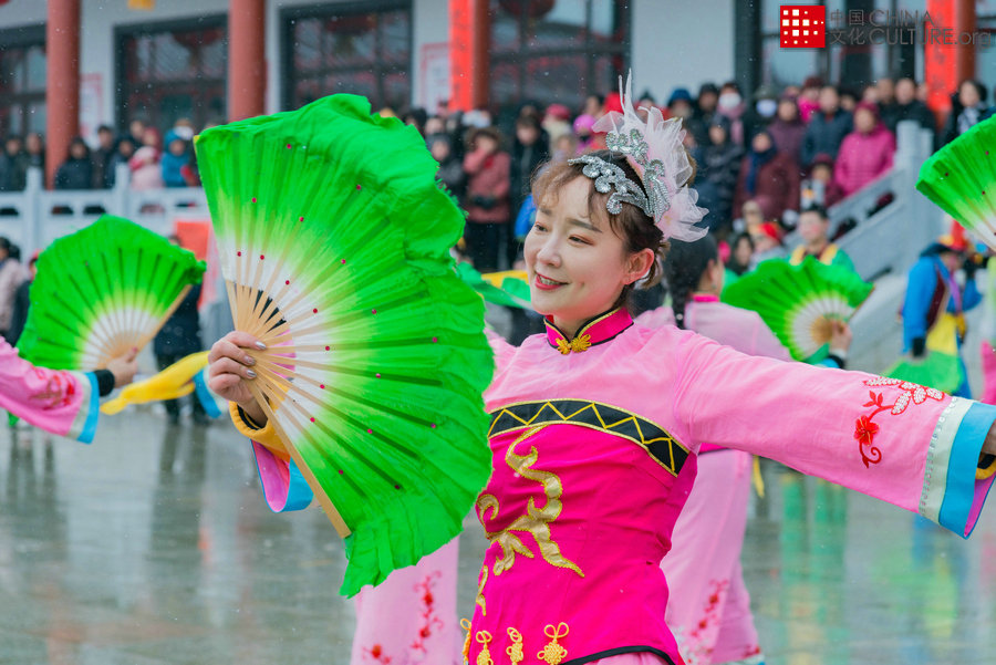 2019年2月13日山東省海陽市郭城鎮(zhèn)西古現(xiàn)村。海陽市委宣傳部,文化旅游局組織春節(jié)送文化下鄉(xiāng)活動,海陽市京劇團來到西古現(xiàn)村冒雪為村民表演國家級非物質(zhì)文化遺產(chǎn)“海陽大秧歌”以及京劇。[攝影:劉福軒]