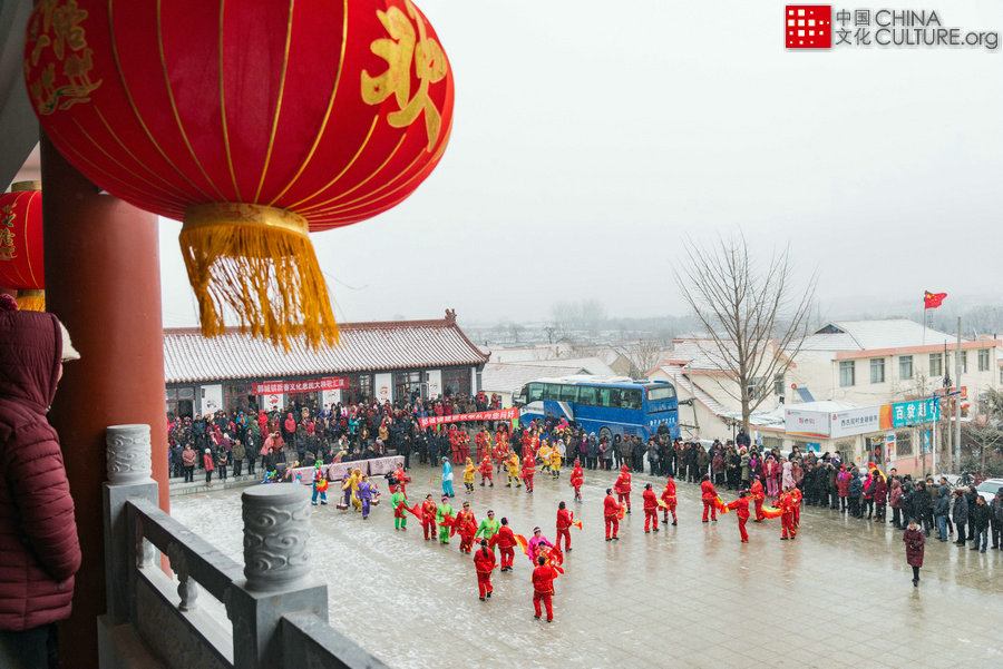 2019年2月13日山東省海陽(yáng)市郭城鎮(zhèn)西古現(xiàn)村。海陽(yáng)市委宣傳部,文化旅游局組織春節(jié)送文化下鄉(xiāng)活動(dòng),海陽(yáng)市京劇團(tuán)來到西古現(xiàn)村冒雪為村民表演國(guó)家級(jí)非物質(zhì)文化遺產(chǎn)“海陽(yáng)大秧歌”以及京劇。[攝影:劉福軒]