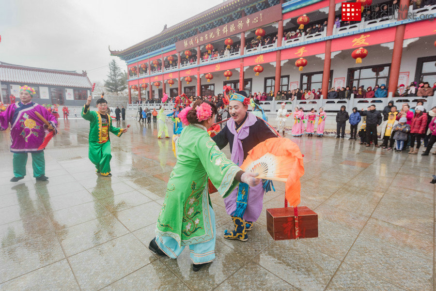 2019年2月13日山東省海陽(yáng)市郭城鎮(zhèn)西古現(xiàn)村。海陽(yáng)市委宣傳部,文化旅游局組織春節(jié)送文化下鄉(xiāng)活動(dòng),海陽(yáng)市京劇團(tuán)來(lái)到西古現(xiàn)村冒雪為村民表演國(guó)家級(jí)非物質(zhì)文化遺產(chǎn)“海陽(yáng)大秧歌”以及京劇。[攝影:劉福軒]