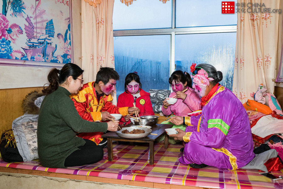 2018年2月21日拍攝于山東省海陽市郭城鎮(zhèn)虎龍莊。一家三代人傳承國家級非物質(zhì)文化遺產(chǎn)“海陽大秧歌”。每年春節(jié)海陽大秧歌有串村拜年演出的習(xí)俗。早晨化完妝,和諧美滿的一家人在一起就餐,然后一起參加演出。[攝影:劉福軒]