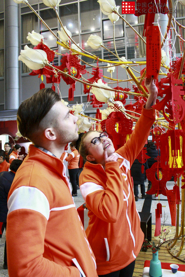 2019年2月19日拍攝于江蘇江陰。一對老外在元宵節(jié)活動上猜燈謎。[攝影:莊東威]