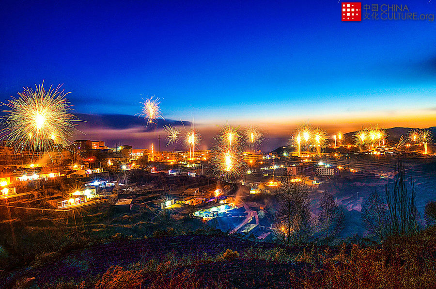2019年2月5日拍攝于山西鄉(xiāng)寧縣。山村家家戶戶點(diǎn)火把,放煙花喜迎新年到來。[攝影:趙學(xué)榮]