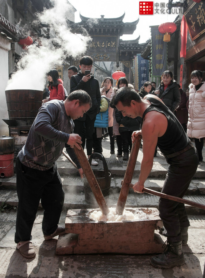 2020年1月20日拍攝于湖南省懷化市洪江古商城。打糍粑是中國節(jié)日風(fēng)俗。流行于我國南方地區(qū),又以湘西地區(qū)的懷化、自治州等地最為盛行。尤其是在過年等重要節(jié)日的時(shí)候,每家每戶必須要打糍粑,作為節(jié)日食品供客人品嘗。每年一到臘月,各種濃濃的年味便會(huì)撲面而來:殺年豬、做糯米酒、打糍粑……每家每戶都熱火朝天地忙碌著,籌備著,歡笑著,到處都洋溢著節(jié)日濃濃的氣氛。[攝影:田文國]