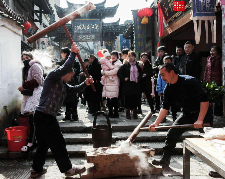 2020年1月20日拍攝于湖南省懷化市洪江古商城。打糍粑是中國節(jié)日風俗。流行于我國南方地區(qū),又以湘西地區(qū)的懷化、自治州等地最為盛行。尤其是在過年等重要節(jié)日的時候,每家每戶必須要打糍粑,作為節(jié)日食品供客人品嘗。每年一到臘月,各種濃濃的年味便會撲面而來:殺年豬、做糯米酒、打糍粑……每家每戶都熱火朝天地忙碌著,籌備著,歡笑著,到處都洋溢著節(jié)日濃濃的氣氛。[攝影:田文國]