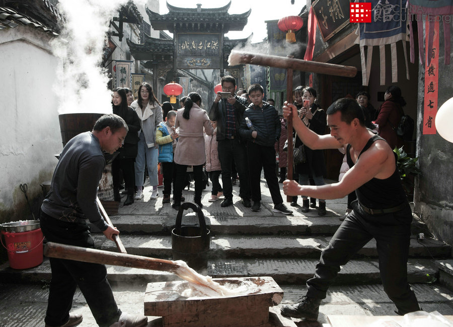 2020年1月20日拍攝于湖南省懷化市洪江古商城。打糍粑是中國(guó)節(jié)日風(fēng)俗。流行于我國(guó)南方地區(qū),又以湘西地區(qū)的懷化、自治州等地最為盛行。尤其是在過(guò)年等重要節(jié)日的時(shí)候,每家每戶(hù)必須要打糍粑,作為節(jié)日食品供客人品嘗。每年一到臘月,各種濃濃的年味便會(huì)撲面而來(lái):殺年豬、做糯米酒、打糍粑……每家每戶(hù)都熱火朝天地忙碌著,籌備著,歡笑著,到處都洋溢著節(jié)日濃濃的氣氛。[攝影:田文國(guó)]
