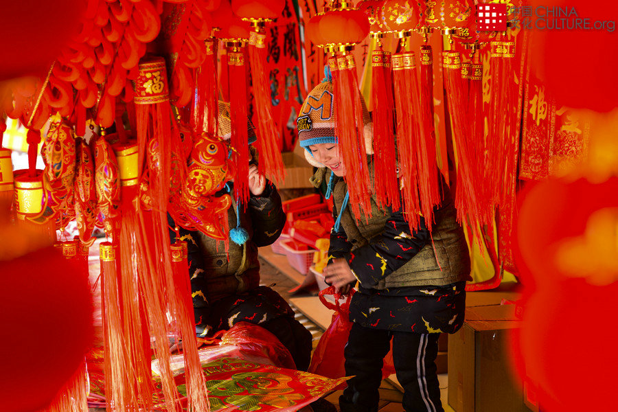 2019年1月27日拍攝于江蘇省鹽城市大豐區(qū)城區(qū)。紅紅的掛件上都是福字,孩子們在福中玩耍,幸福滿滿的。[攝影:朱兆平]