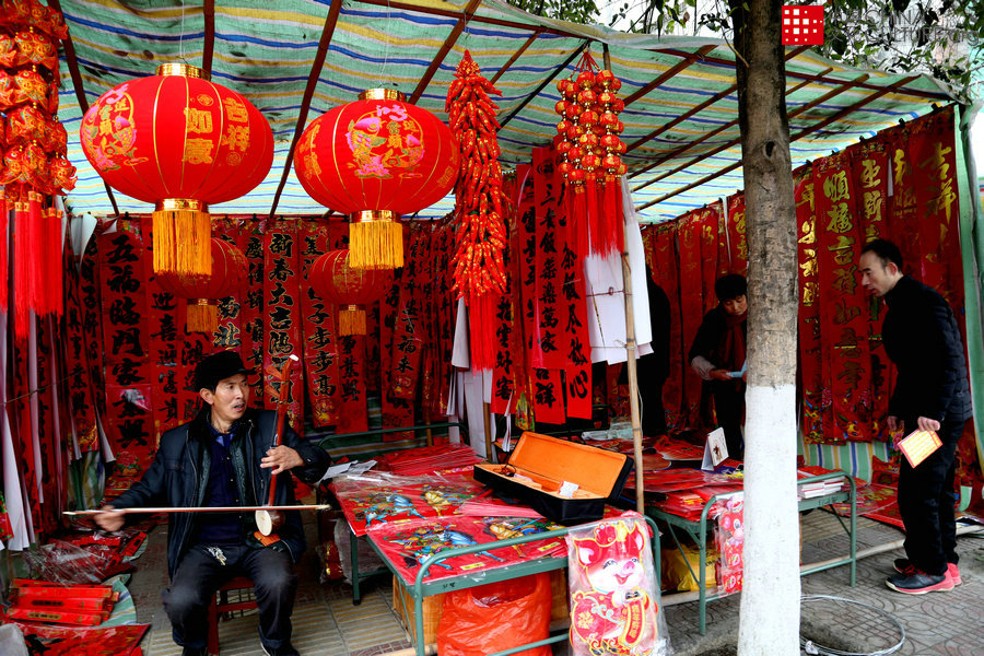 2019年1月30日拍攝于甘肅兩當縣。賣年貨的老板一邊拉二胡一邊看鋪子,樂在其中。[攝影:王開琮]