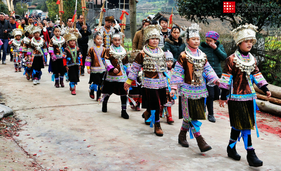 2015年3月2日拍攝于廣西融水苗族自治縣。正月元宵節(jié)是苗家的蘆笙盛會。在融水苗族自治縣的坡地上,豎起了幾根蘆笙柱,歡樂的男女青年一群群圍著蘆笙柱轉(zhuǎn),男的拿著蘆笙,女的拿著花傘,每柱周圍都有一支蘆笙隊在歡奏,這就是苗族坡會。[攝影:陳浦生]