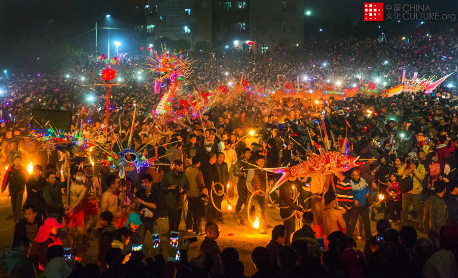 2017年2月11日拍攝于廣東省豐順縣浦寨。為祈求新的一年風(fēng)調(diào)雨順、百業(yè)興旺,每年元宵節(jié),廣東省豐順縣埔寨鎮(zhèn)都將舉行傳統(tǒng)的“燒火龍”表演活動。聲勢浩大、獨(dú)具特色的“燒火龍”活動吸引了數(shù)萬名觀眾前來觀賞。[攝影:黃建軍]