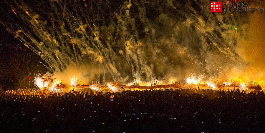 2017年2月11日拍攝于廣東省豐順縣浦寨。為祈求新的一年風調(diào)雨順、百業(yè)興旺,每年元宵節(jié),廣東省豐順縣埔寨鎮(zhèn)都將舉行傳統(tǒng)的“燒火龍”表演活動。聲勢浩大、獨具特色的“燒火龍”活動吸引了數(shù)萬名觀眾前來觀賞。[攝影:黃建軍]