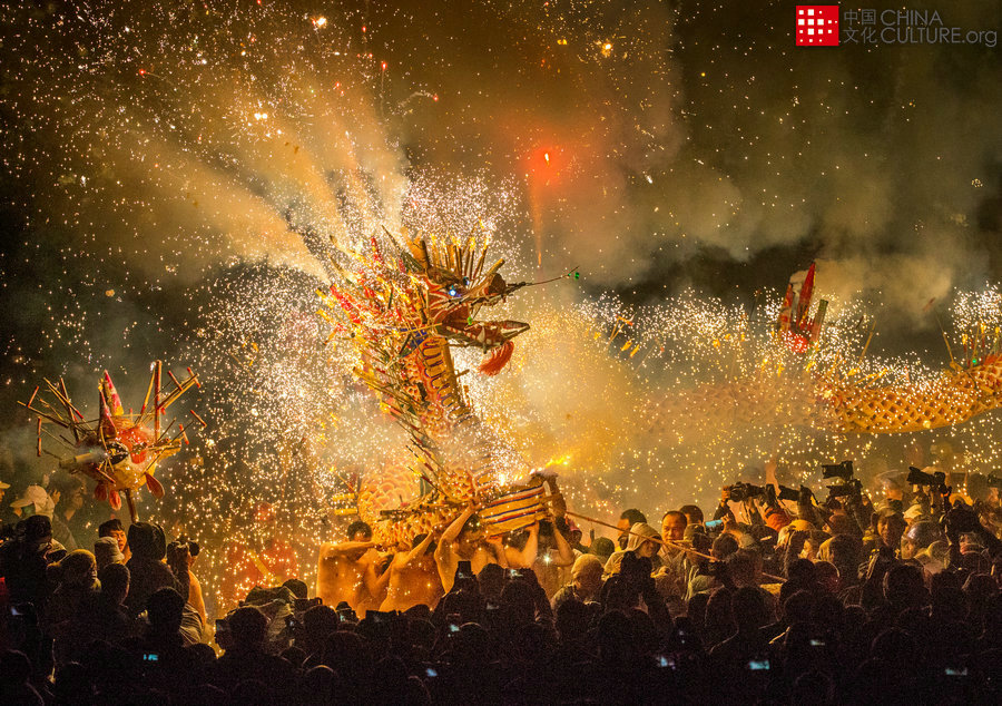 2017年2月11日拍攝于廣東省豐順縣浦寨。為祈求新的一年風調雨順、百業(yè)興旺,每年元宵節(jié),廣東省豐順縣埔寨鎮(zhèn)都將舉行傳統(tǒng)的“燒火龍”表演活動。聲勢浩大、獨具特色的“燒火龍”活動吸引了數(shù)萬名觀眾前來觀賞。[攝影:黃建軍]