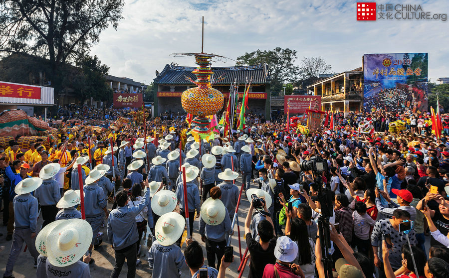2019年2月16日拍攝于廣東省開(kāi)平市水口鎮(zhèn)泮村。廣東省開(kāi)平市水口鎮(zhèn)泮村鄉(xiāng)有一個(gè)別具特色的民間習(xí)俗——泮村燈會(huì)。每年農(nóng)歷正月十三,泮村鄉(xiāng)彩旗蔽日,炮竹聲聲。四十多個(gè)村莊,家家戶戶張燈結(jié)彩,喜氣洋洋。全鄉(xiāng)群眾,簇?fù)碇锥喔叩拇蠡?,以羅傘開(kāi)路,龍獅伴隨,從早晨到黃昏,游遍全鄉(xiāng)。[攝影:黃建軍]