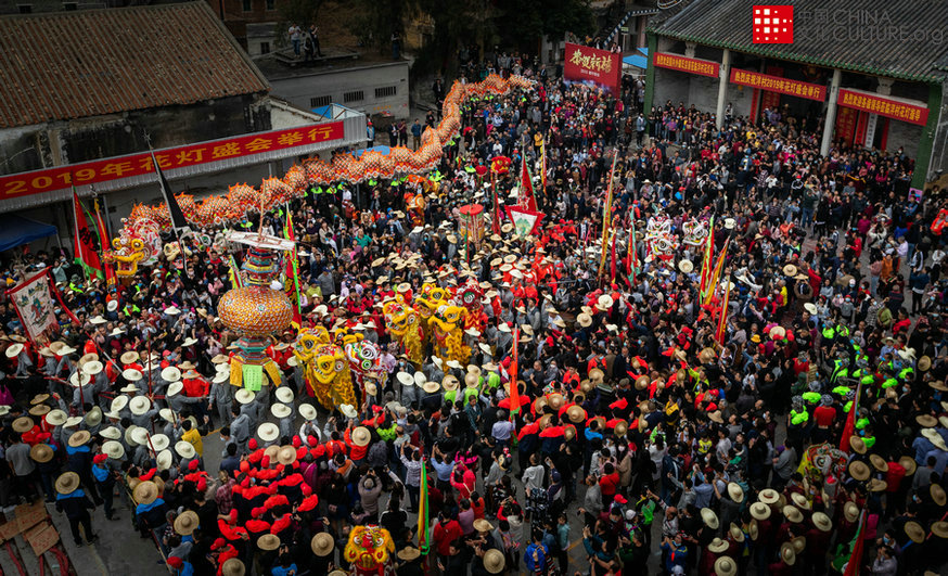 2019年2月16日拍攝于廣東省開平市水口鎮(zhèn)泮村。廣東省開平市水口鎮(zhèn)泮村鄉(xiāng)有一個別具特色的民間習俗——泮村燈會。每年農(nóng)歷正月十三,泮村鄉(xiāng)彩旗蔽日,炮竹聲聲。四十多個村莊,家家戶戶張燈結彩,喜氣洋洋。全鄉(xiāng)群眾,簇擁著三米多高的大花燈,以羅傘開路,龍獅伴隨,從早晨到黃昏,游遍全鄉(xiāng)。[攝影:黃建軍]