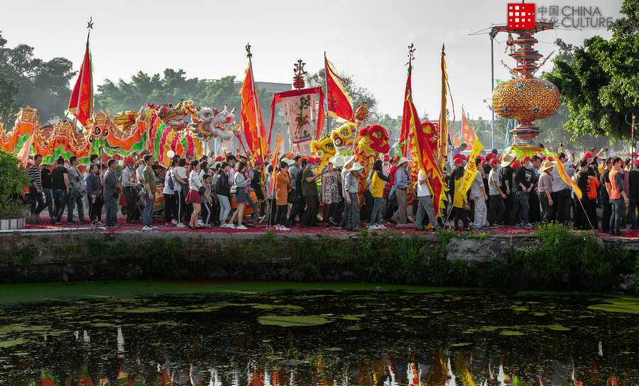 2019年2月16日拍攝于廣東省開(kāi)平市水口鎮(zhèn)泮村。廣東省開(kāi)平市水口鎮(zhèn)泮村鄉(xiāng)有一個(gè)別具特色的民間習(xí)俗——泮村燈會(huì)。每年農(nóng)歷正月十三,泮村鄉(xiāng)彩旗蔽日,炮竹聲聲。四十多個(gè)村莊,家家戶戶張燈結(jié)彩,喜氣洋洋。全鄉(xiāng)群眾,簇?fù)碇锥喔叩拇蠡?,以羅傘開(kāi)路,龍獅伴隨,從早晨到黃昏,游遍全鄉(xiāng)。[攝影:黃建軍]