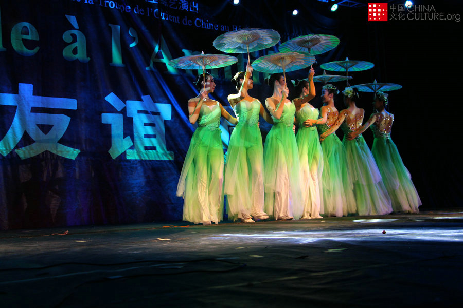 Photo taken at the Halls of Arts and Culture in Cotonou, Benin on Jan 26, 2019. The dance "Bamboo shadow to the moon" at the 10th Chinese New Year Festival 2019 in Benin. [Photo by Degan Gabin]
