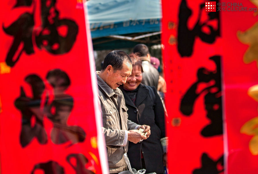 2020年1月21日拍攝于陜西省漢中市勉縣元墩鎮(zhèn)集市。陜西漢中勉縣元墩鎮(zhèn)集市上買春聯(lián)的夫婦,過(guò)年的喜悅心情洋溢在臉上。[攝影:徐鵬]