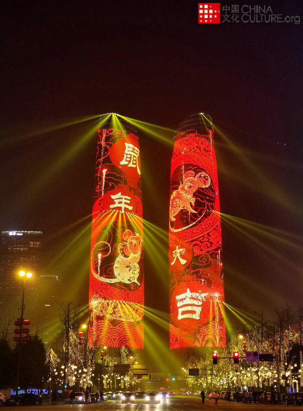 2020年1月23日拍攝于四川成都。天府金融城“雙子塔”亮燈迎春,似兩根巨大的熒光棒在夜色下閃爍著耀眼的光芒。[攝影:艾加憲]