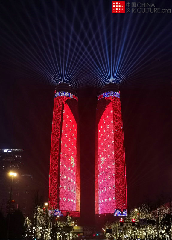 2020年1月23日拍攝于四川成都。天府金融城“雙子塔”亮燈迎春,似兩根巨大的熒光棒在夜色下閃爍著耀眼的光芒。[攝影:艾加憲]