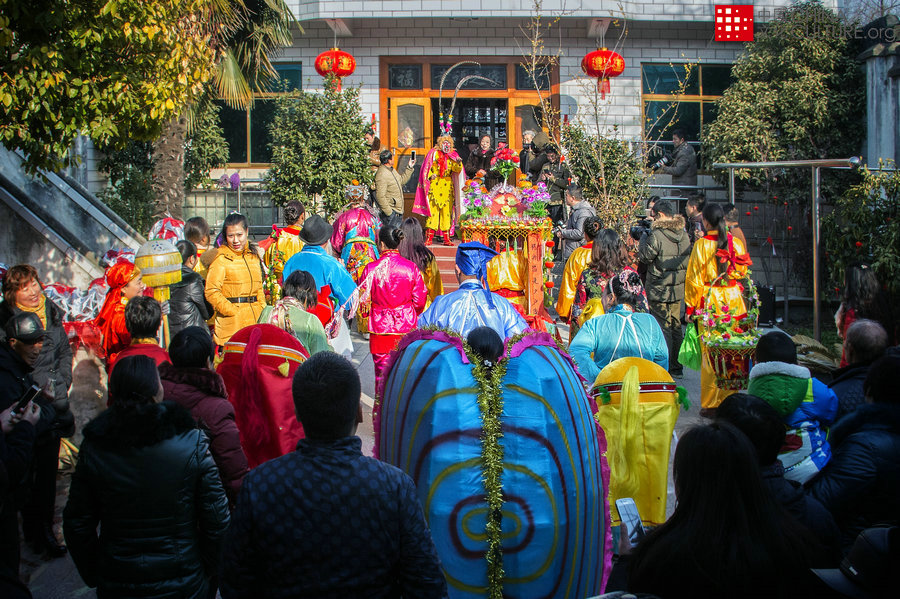 2016年2月8日拍攝于中國江蘇揚(yáng)州市吳橋鎮(zhèn)。吳橋社火戲是揚(yáng)州非物質(zhì)文化遺產(chǎn),主要有花船、龍燈、馬燈等幾種表演形式。每年的大年初一吳橋社火都會(huì)走村進(jìn)戶進(jìn)行表演,給村民們拜年。[攝影:蔣志根]