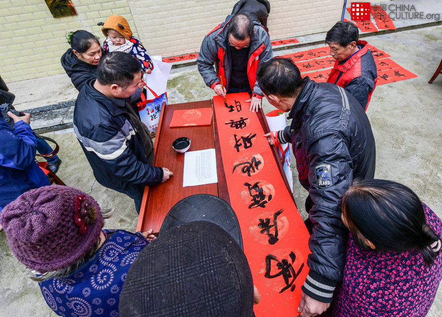 2020年1月17日拍攝于湖南省祁陽(yáng)縣大忠鎮(zhèn)開(kāi)陽(yáng)崗村。祁陽(yáng)縣文聯(lián)組織祁陽(yáng)縣書(shū)法家協(xié)會(huì)6位中國(guó)書(shū)法家協(xié)會(huì)會(huì)員到大忠鎮(zhèn)開(kāi)陽(yáng)崗村給村民寫(xiě)春聯(lián)賀新春。[攝影:鄧宏鈺]
