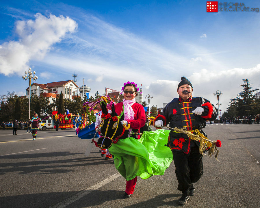 2014年2月9日拍攝于山東威海乳山市。乳山大秧歌是一種具有濃郁的地方特色的傳統(tǒng)民間舞蹈。形式有跑旱船、耍龍燈、騎黑驢、踩高蹺、舞獅子、唐僧師徒取經、豬八戒背媳婦等,也經常出現在大秧歌隊伍中。這個作品是騎黑驢。[攝影:宮巨]