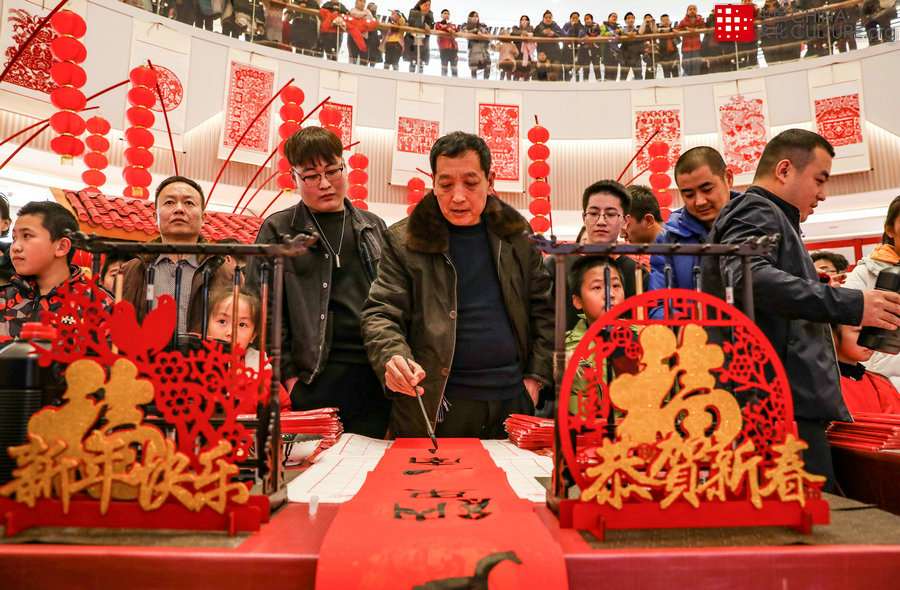2020年1月19日拍攝于山西省孝義市。山西省孝義市文聯(lián)主辦的2020民俗文化節(jié)開幕式上,各種民俗文化展演精彩紛呈,書法家們揮毫潑墨,把一幅幅帶有美好祝愿的春聯(lián)送到市民手中。[攝影:劉海霞]