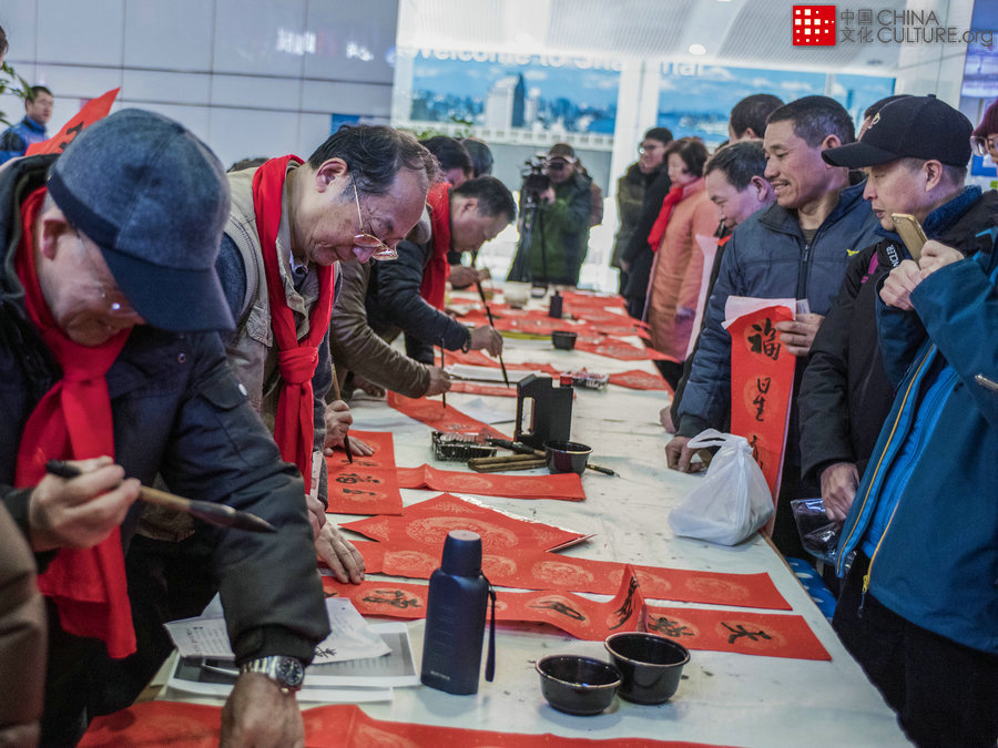 2019年1月21日拍攝于上海。上?;疖囌荆ㄐ驴驼荆I虾J徐o安滬尚墨緣書畫文化公益中心的書畫家,到新客站為回家的旅客寫春聯(lián),讓旅客帶上上海人民的新春祝福高高興興回家。[攝影:萬海民]