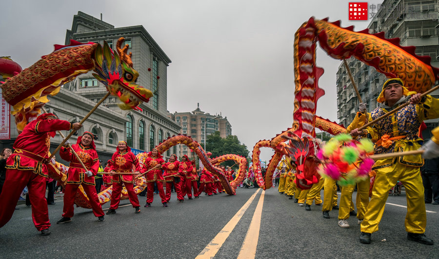 2018年3月2日拍攝于武漢東西湖區(qū)。從春節(jié)到元宵燈節(jié),許多地方都有舞龍的習(xí)俗,武漢市東西湖區(qū)的迎新年活動(dòng)。[攝影:于琳]