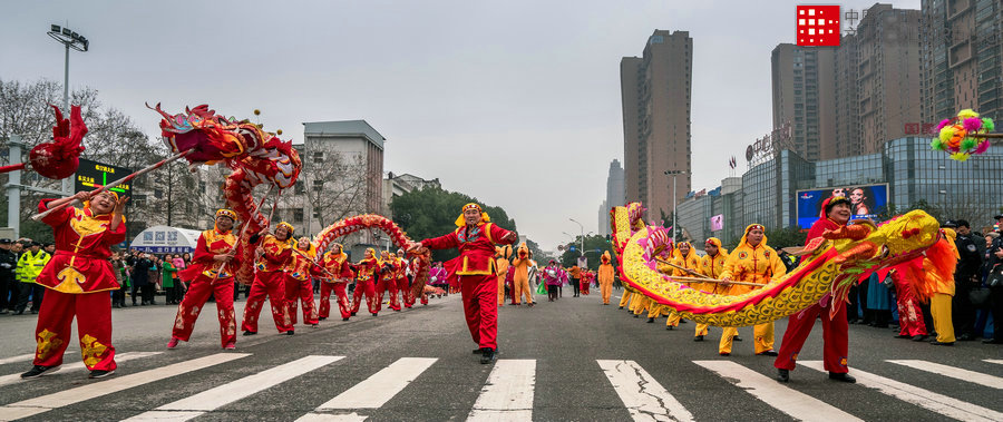 2018年3月2日拍攝于武漢東西湖區(qū)。從春節(jié)到元宵燈節(jié),許多地方都有舞龍的習(xí)俗,武漢市東西湖區(qū)的迎新年活動(dòng)。[攝影:于琳]