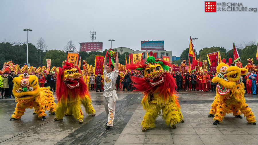 2018年3月2日拍攝于武漢市東西湖區(qū)。從春節(jié)到元宵燈節(jié),許多地方都有舞獅的習(xí)俗,武漢市東西湖區(qū)的迎新年活動(dòng)。[攝影:于琳]