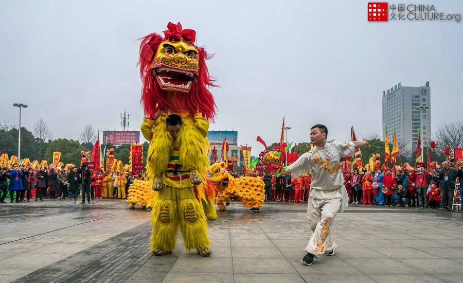 2018年3月2日拍攝于武漢市東西湖區(qū)。從春節(jié)到元宵燈節(jié),許多地方都有舞獅的習(xí)俗,武漢市東西湖區(qū)的迎新年活動(dòng)。[攝影:于琳]